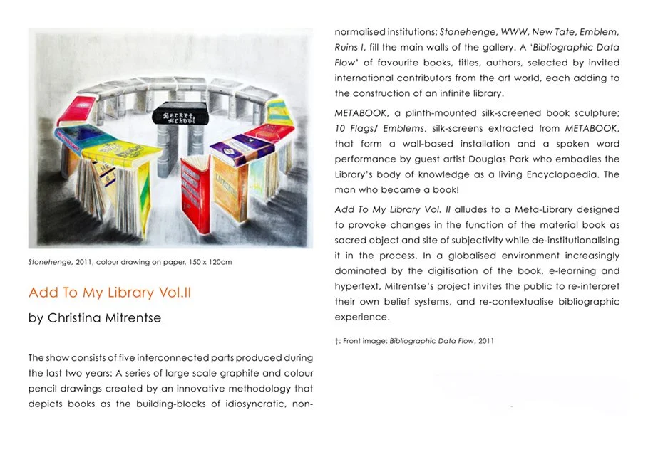 BDF Publication Vol.III of international Book Art project initiative by Christina Mitrentse. A double sided, colour A2 poster, limited edition of 300, designed by Blacklist editions and includes writing by Dr. Areti Leopoulou curator/Art Historian CACT. Kindly supported by Scholars Association of Onassis Public Benefit Foundation. ©mitrentse 2014. The project has so far positively promoted and encouraged audience participation that attracted over 300 international participants from as far afield as China. It has been an honour to host the complete list of international arts, cultural, academic figures, book collectors and bookshops, who contributed their selected Books for the production of Vol.III. A large number of contributors include academic researchers and stuff from London Universities and Museums, Philosophy & Art Department University of Barcelona, Publishers & Bookshops from Greenwich area London, Academic staff of University of Greenwich London, Women’s Arts Library Goldsmiths University (MAKE magazine), State Museum of Contemporary Art Greece, Bank of Greece Cultural Foundation, and Onassis Foundation Scholars. ATML both acts as an on-line reference Library for public use and as a total work of art.